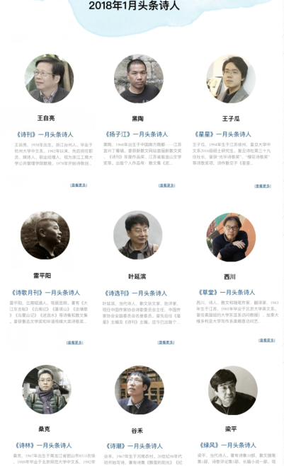 2018年1月,12家诗歌刊物的“头条诗人”在“中国诗歌网”的“头条诗人”栏目上集体亮相,优秀的诗人们在网络平台上,开起了“群英会”。喜欢诗歌的读者有福了!读者可以在同一个平台上,点击欣赏他们的代表诗作。这样高效又方便,引来诗歌圈一片叫好声。