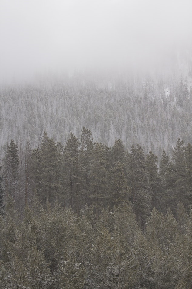 雪松和柏树伸展着托住大量的雪。我穿过树林。