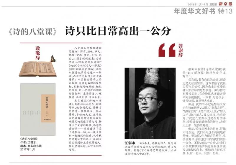 今年4月23日,《诗的八堂课》荣膺2017年度“中国好书”。江弱水携新书《诗的八堂课》登上了央视,与著名演员柳云龙合作进行了一场“品诗歌之美”的文学分享会。