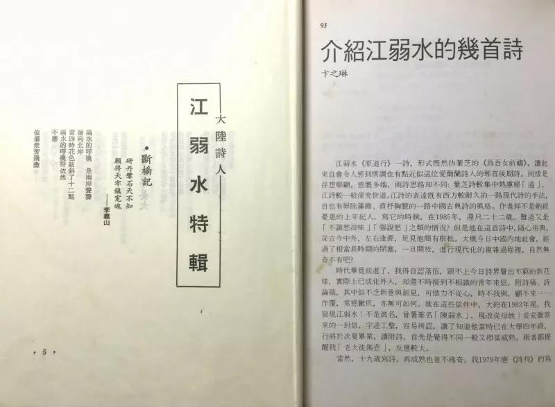 八十年代中期,经由卞之琳先生介绍,江弱水结识了余光中先生,开始由余先生在台湾发表诗与随笔。余先生在其主编的《蓝星》诗刊,曾专门登载过《江弱水特辑》。后来,江弱水到香港中文大学攻读哲学博士学位,毕业论文便是《卞之琳诗艺研究》,而论文的评审委员之一便是诗人余光中。