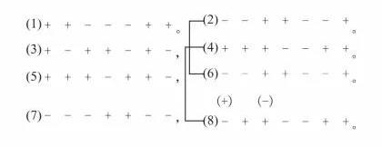 第二,亦单句与单句相重间双句,双句与双句相重间单句,但分为两组,1234句为一组,5678句另为一组,其式如下: