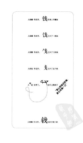 第三,拆字法成诗。《刹那花开》,由小及大的“花”字,形象展现花开花落的全过程,最后,风来,花字被拆落一地。《两颗心》两个心字,由远至近,日益缠绵,谈了场恋爱的结果是,心被拆得七零八落,碎了一地。《客车上遭劫的人》,昏睡的乘客被偷,钱字被偷得不成字样,当只剩“戈”字时,被偷的乘客乍醒,挥刀,结果钱字还多了几笔,形象地再现了一出人生历险记。