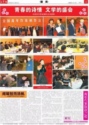 2007年11月13日至16日,由中国作协和共青团中央联合召开的全国青年作家创作会议在京举行。300多名青年作家代表和特邀作家代表参加会议。中共中央政治局常委李长春出席会议并讲话。中共中央政治局委员、中央书记处书记、中宣部部长刘云山出席会议。中国作协主席铁凝致开幕词。团中央书记处第一书记胡春华在开幕式上致祝词。中国作协党组书记、副主席金炳华作了题为《新世纪中国文学的青春远航》的报告。中国作协副主席高洪波作了会议总结。