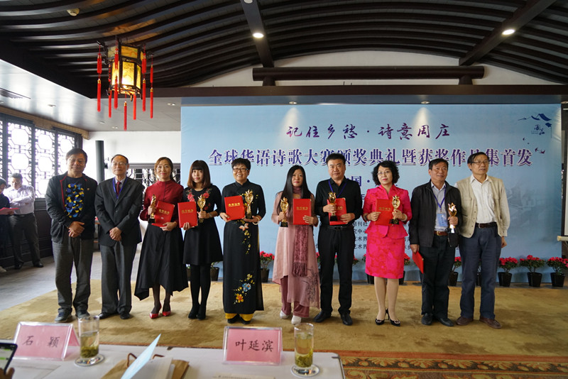 颁奖典礼上,各大奖项一一揭晓。诗人牛庆国的诗作《周庄诗篇》与张家玮的诗作《蝴蝶绝句》共同斩获一等奖,青小衣、王文海、蔡明菊、黄劲松、蓉儿、张琳、马志宝、季风、李青萍、魏晓弘10位诗人的诗作获得二等奖,蒋志武、安娟英、王太文等30位诗人的诗作获颁三等奖,赵传昌、陈菲、黄晓华、马丽芬等50名诗人的作品分获优秀奖。著名诗评家吕进、蒋登科为获一二等奖的十二件作品分别撰写了颁奖词,并当场宣读或由人代读。颁奖典礼上,对部分获奖作品进行了诵读表演,另外穿插了苏州评弹等具地方特色的文艺节目。颁奖典礼后,与会嘉宾诗人畅游了周庄古镇和香村祁庄,品昆曲,赏灯会。周庄独特的人文景观让与会嘉宾诗兴盎然、流连忘返。