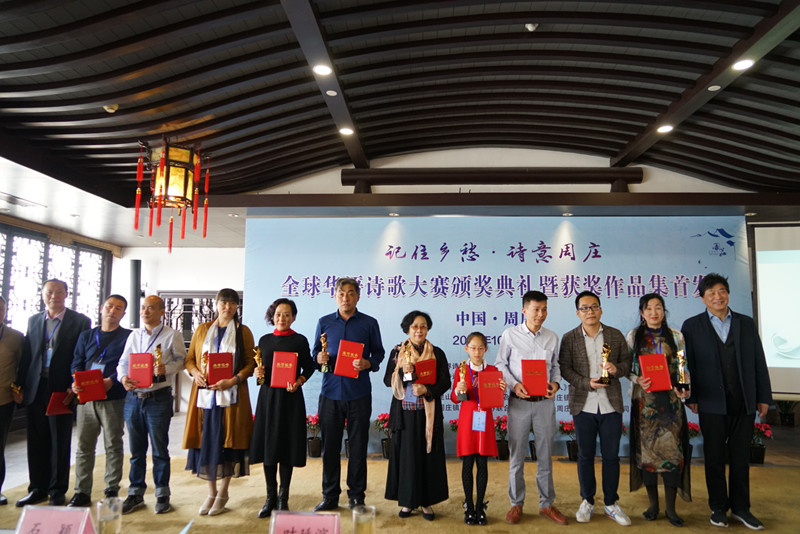 金秋丹桂飘香,周庄诗意荡漾。由中国诗歌网、中国新诗研究所、中国诗学研究中心、《诗选刊》杂志社、《当代诗人》杂志社与昆山市文联、周庄镇政府共同主办,周庄镇文学艺术界联合会、江苏水乡周庄旅游股份有限公司联合承办的“记住乡愁·诗意周庄”全球华语诗歌大赛颁奖典礼,10月13日在水乡周庄举行,92篇诗作分获一二三等及优秀奖。本次获奖作品,已结集正式出版,并在同一时间举行首发仪式。昆山市副市长李文到场致辞,《当代诗人》杂志社主编毕福堂致答谢词,中国作协副主席叶辛发表即兴讲话,畅谈文化与旅游的关系,他认为,文化与旅游的融合富有想象空间,而且现在只是一个开端。