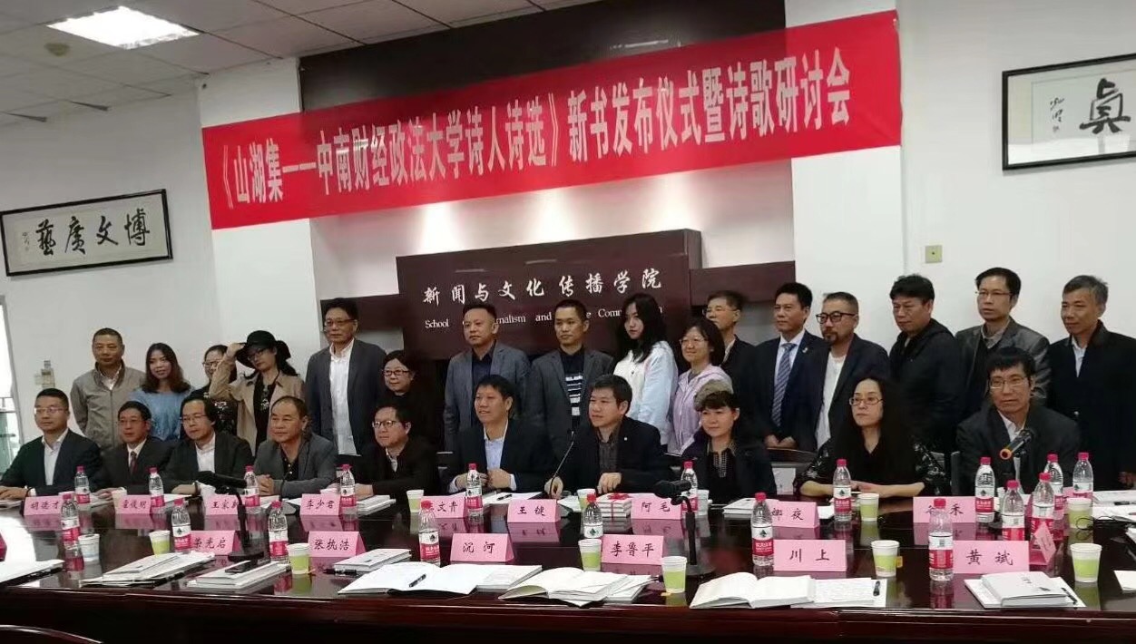 2018年10月21日上午《山湖集——中南财经政法大学诗人诗选》新书发布仪式暨诗歌研讨会在中南财经政法大学南湖校区举行。出席本次会议的有中南财经政法大学党委副书记王文贵、新闻与文化传播学院院长胡德才、中南财经政法大学北京校友会秘书长蔡晖、著名诗人、《山湖集》主编王键和阿毛。
