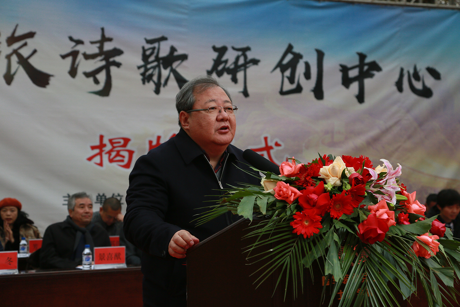 中国作家协会吉狄马加副主席宣布“军旅诗歌研创中心”成立并致辞。