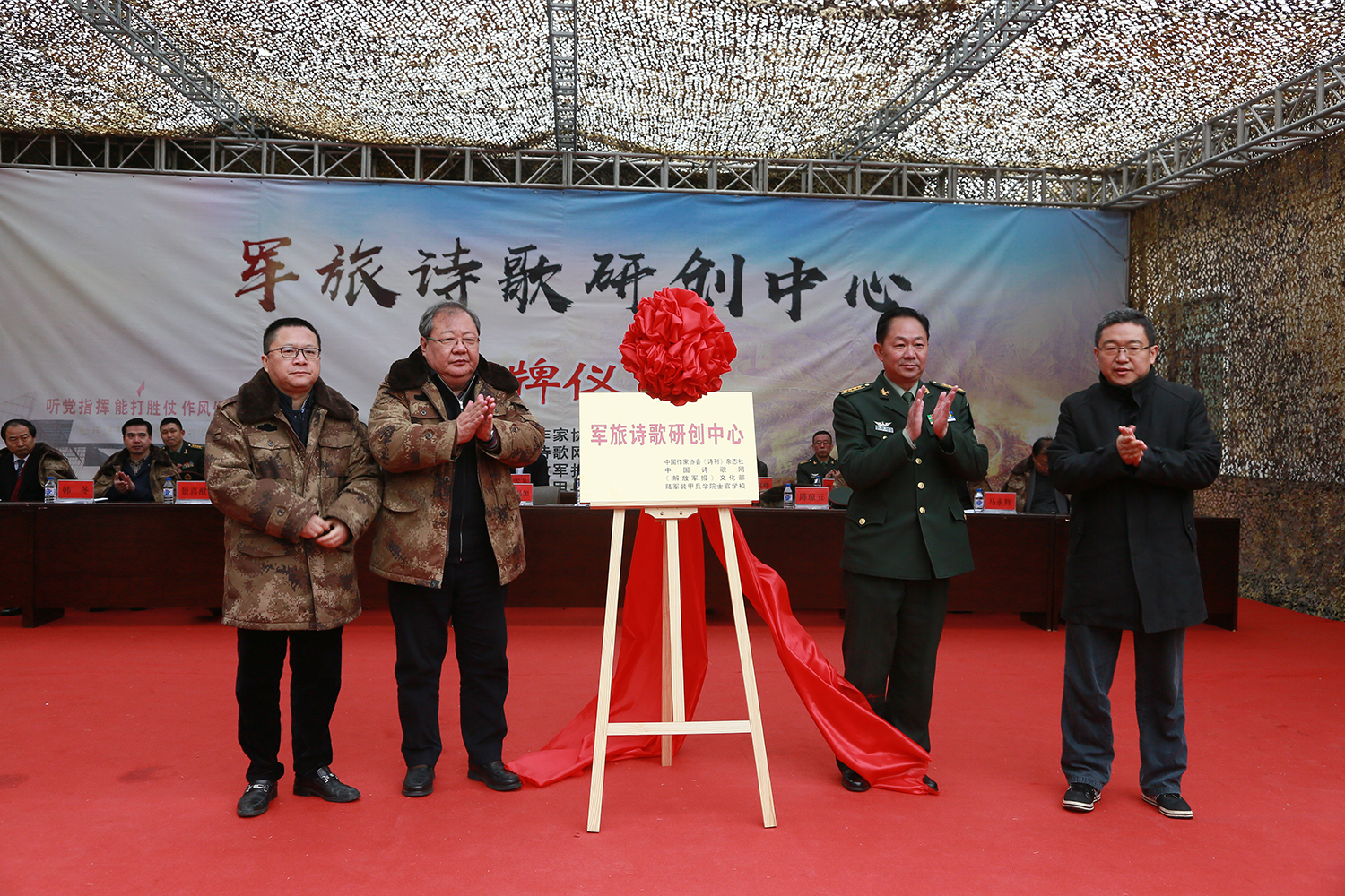 中国作家协会吉狄马加副主席、《诗刊》社李少君副主编、《解放军报》文化部刘笑伟主任、陆军装甲兵学院士官学校陈琼玉政委“军旅诗歌研创中心”揭牌。
