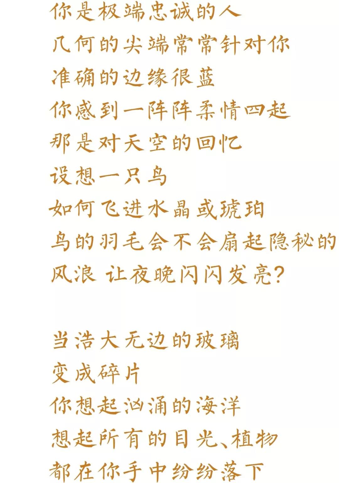 在诗中,手拿钻石刀的割玻璃人无疑是诗人的自我形象。割玻璃不仅需要锐利的工具,更需要全神贯注的精神、坚定的手腕、高超的技艺。这和诗人的工作非常类似,只是诗人的工作是从广阔的“海洋”“天空”中萃取人类文明的结晶。