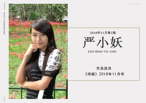 严小妖,女,1989年5月生于贵州。诗作散见《新世纪诗典》《诗歌周刊》《女诗人诗选》《诗歌杂志》《中国教师现代诗选》《贵州都市报》《诗潮》等。
