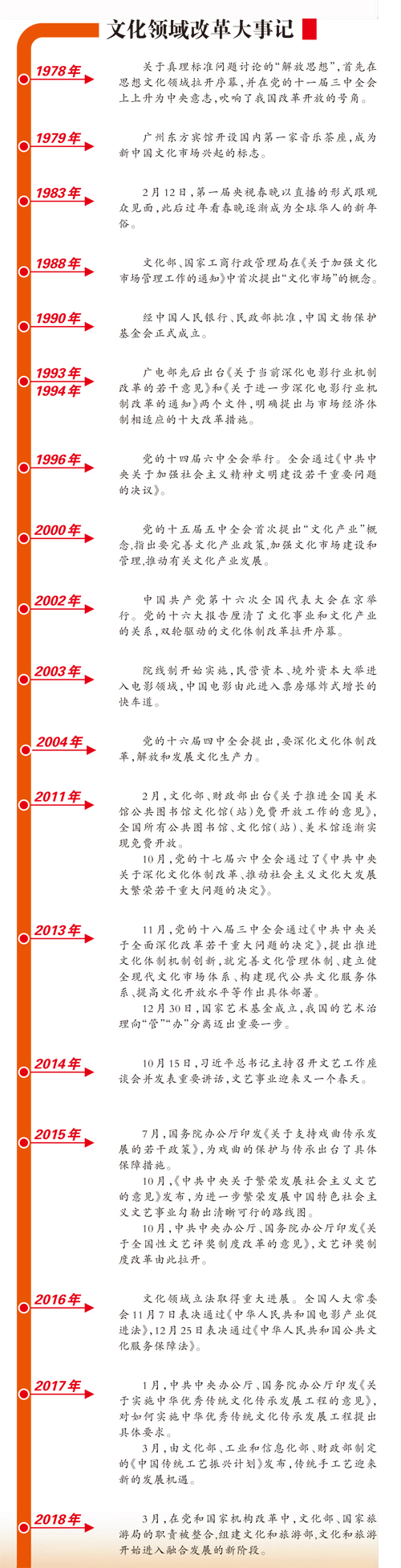 毛泽东同志有句名言:“政策和策略是党的生命,万万不可粗心大意。”改革开放之初,党审时度势,总揽全局,辩证分析,实事求是地对文艺政策进行调整,这才有了后面40年文化事业的健康持续繁荣。1978年,党的十一届三中全会决定全党工作从过去的以阶级斗争为纲转为以经济建设为中心,在这一总背景下,聚焦于文艺与政治的关系,果断地以“文艺为人民服务、为社会主义服务”即“二为”方向取代过去战争年代以来一直实行的“文艺为政治服务”。改革开放的总设计师邓小平同志在第四次文代会上更是指出:“党对文艺工作的领导,不是发号施令,不是要求文学艺术从属于临时的、具体的、直接的政治任务,而是根据文学艺术的特征和发展规律,帮助文艺工作者获得条件来不断繁荣文学艺术事业,提高文学艺术水平,创作出无愧于我们伟大人民、伟大时代的优秀的文学艺术作品和表演艺术成果。”