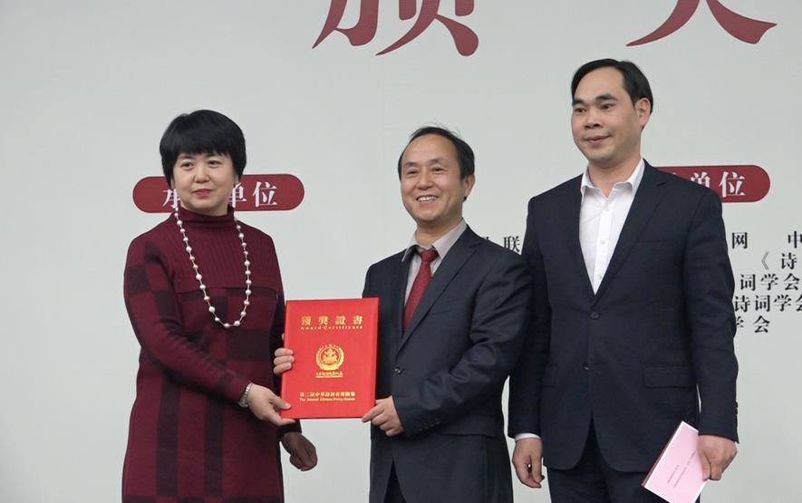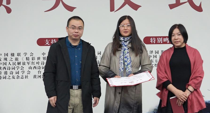 诗刊社中国诗歌网总编辑金石开(左一)、诗刊社编辑刘能英(右一)为优秀奖代表王安静(中)颁奖
