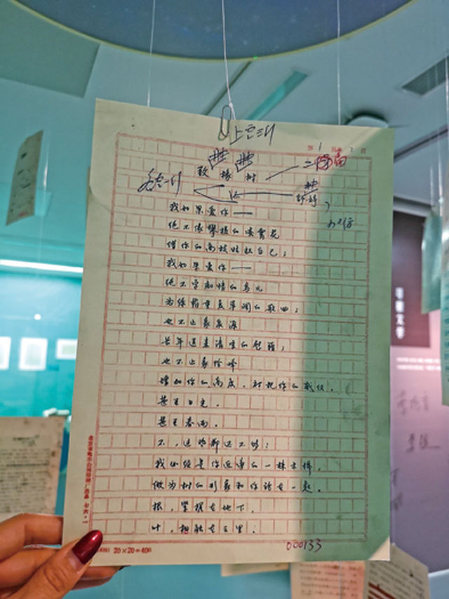 舒婷的诗歌代表作《致橡树》就写在42年前的两页“北京市电车公司印刷厂”印制的红色格子稿纸上。如今它被串上线,悬挂在中国现代文学馆的展厅中央。