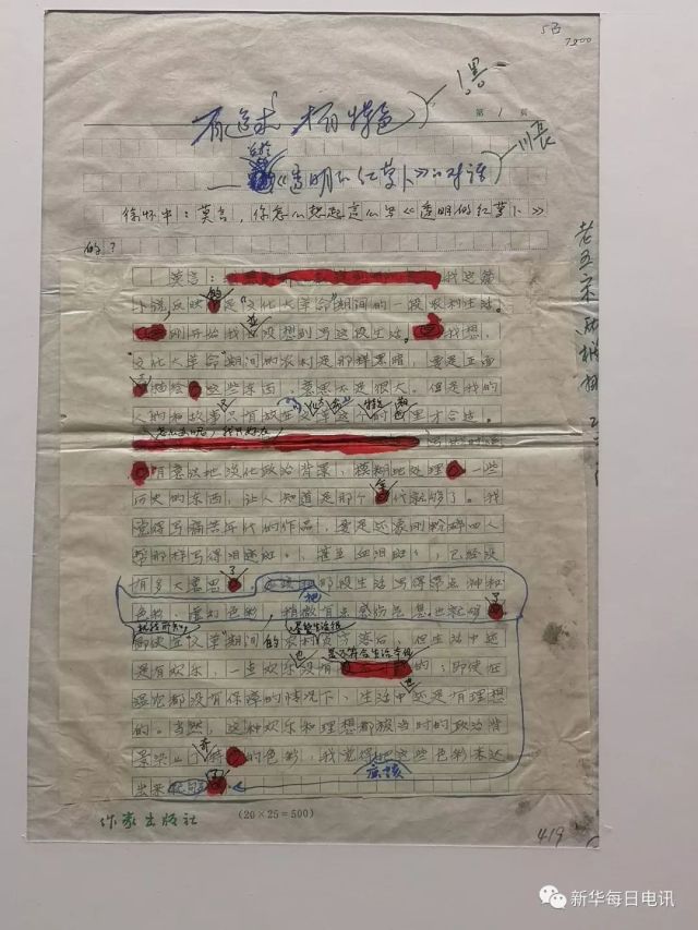 莫言和徐怀中关于《透明的红萝卜》的对话《有追求,才有特色》手稿,莫言此时就读于解放军艺术学院文学系,徐怀中为文学系系主任。记者张漫子摄