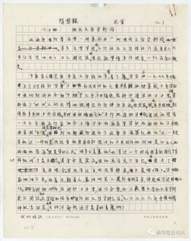 作家巴金《随想录》手稿。中国现代文学馆供图