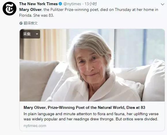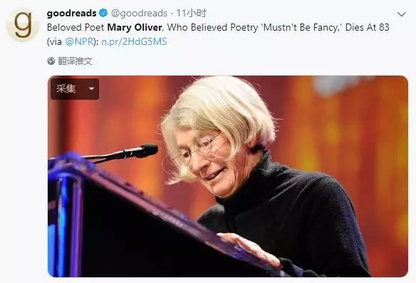 知名书评网站goodreads写道,“那位相信诗歌‘不必花哨’的诗人玛丽·奥利弗离去,逝世于83岁高龄。”
