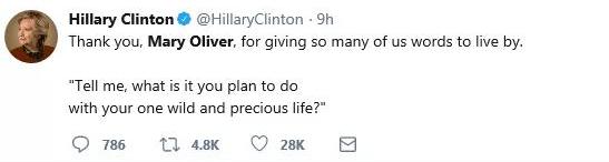 而最大牌的无疑来自美国前国务卿希拉里的悼念,她写道:“谢谢玛丽·奥利弗,有你的文字,很多人才活下去!。”结尾引用了奥利弗《夏日》的诗句,“告诉我,你打算如何度过你狂野而珍贵的一生。”