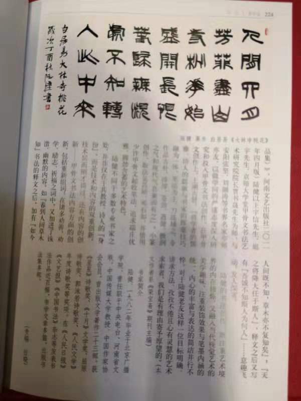 陆健不同于多数专业书家之处并非仅在于其教授、诗人的“身份”,而是技术和内容的双重创新。技术层面刚才谈过,还有内容的创新——甲骨文书法内容方面的创新,包括重新组词:在诸多劝善、劝学、励志、祈福之词之中,又加进了诙谐、幽默的内容。如“春到人间草木知”书法的释文之后,加有“如今人间既不知,草木亦不复知矣”;“天之将降大任于斯人”,释文之后又写有“吾诚不知斯人为何人”……意趣飞动,发人深省。