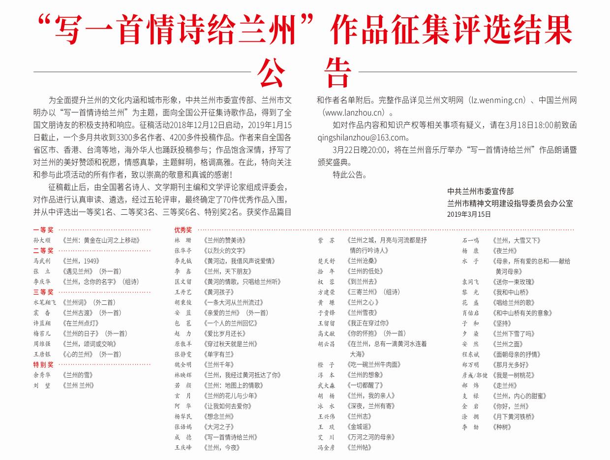 3月22日晚20:00,将在兰州音乐厅举办“写一首情诗给兰州”作品朗诵暨颁奖盛典。 特此公告。