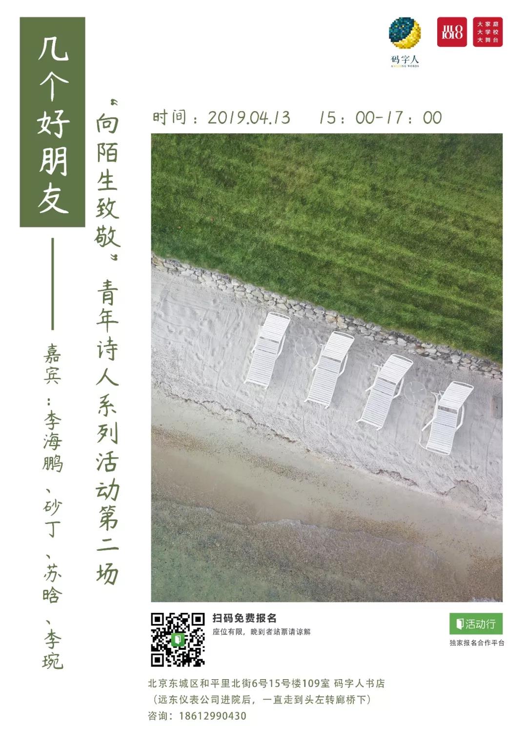 4月13日下午,他们将会在码字人书店朗读自己的作品,并说一说有关诗歌和友谊,严肃或有趣的事。