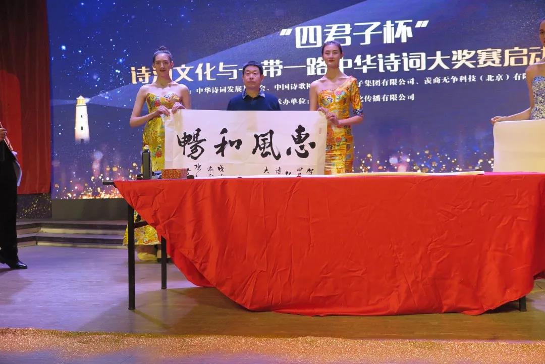 活动在盛世鼓舞表演中开场。羡商无争科技(北京)有限公司CEO李京珍、中华诗词发展基金会秘书长毛炳、中国诗歌网总编辑金石开分别致辞,并与陶自成、孙启祥,刘秀华、汤庆顺、郭晓东、陈廷佑、顾俊峰、李葆国、李新民等嘉宾一起,共同启动了“四君子杯”诗酒文化与一带一路中华诗词大奖赛。现场还举行了山东四君子集团有限公司与天津农学院关于高粱种植基地的签约仪式。