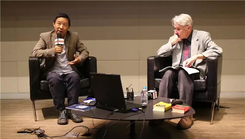 顾彬与欧阳江河是20多年的好朋友,(2014年)9月20日下午13:00,在798艺术区尤伦斯当代艺术中心报告厅,二人以《受伤的汉语》为题,讨论语言在现代进程中的变化。