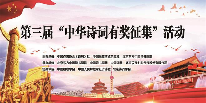 为深入贯彻落实党的十九大精神和习近平新时代中国特色社会主义思想,践行习近平总书记关于文学创作的系列重要讲话精神;进一步传承中华民族优秀传统文化,催生更多诗词精品,为时代立传,为人民放歌,庆祝中华人民共和国建国七十周年,迎接中国共产党建党一百周年;用美丽的中国文字演绎中华雄风、盛世气象,继而全面推进中华民族伟大复兴。中国作家协会《诗刊》社、中国民族博览杂志社、北京东方中国诗书画院联合举办第三届“中华诗词有奖征集”活动,并于2019年5月19日在中国现代文学馆召开新闻发布会,面向海内外隆重征稿。