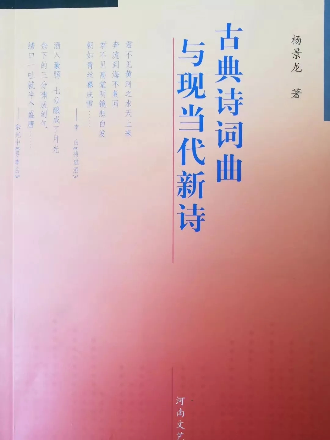 因此,能够承担古典诗歌与新诗比较研究这样课题的,必须是一种复合型人才。他既要有古典诗学的深厚修养,又要有对新诗历史与现状的全面把握;既要热爱古典诗歌,又要对新诗有浓烈的兴趣。这样的人才尽管难得,但不是没有,《古典诗词曲与现当代新诗》的作者杨景龙先生就是其中的一位。