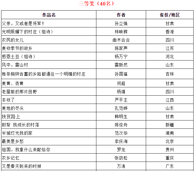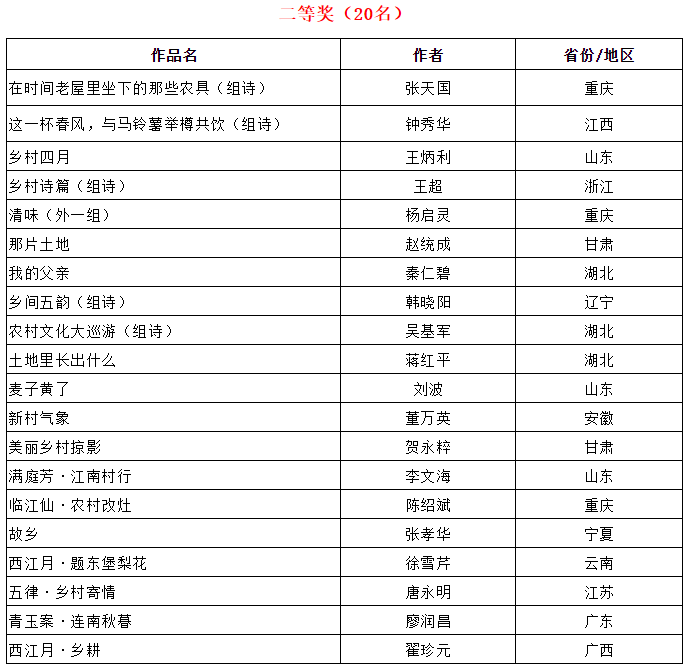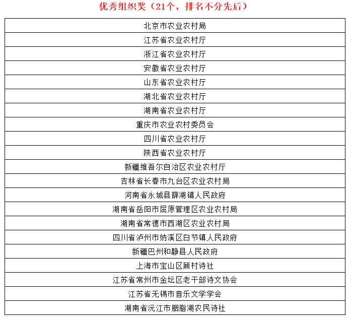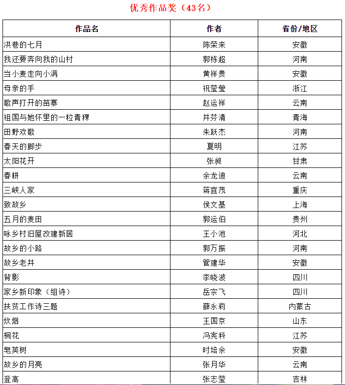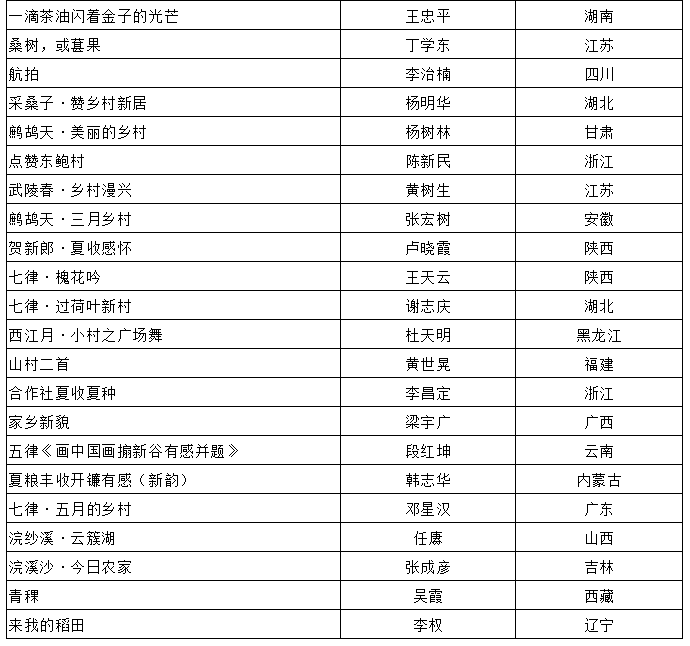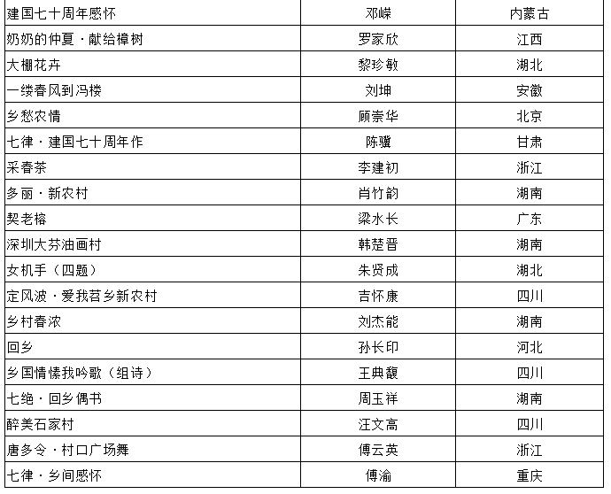在农业农村部农村社会事业促进司指导下,由中国农村杂志社、中国作协《诗刊》社、中国诗歌网联合主办的2019年“礼赞祖国·诗韵乡村”全国乡村诗歌征集已基本结束。组委会根据入围作品的复评终评得分排序,综合各地方组织参加此次征集的情况,共评选出一等奖10名、二等奖20名、三等奖40名、优秀作品奖43名、优秀组织奖21个,现公布如下。