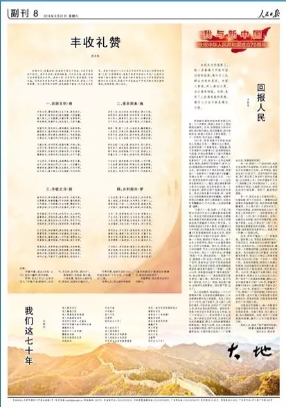 9月21日的《人民日报》第8版,刊发了农业农村部党组书记、部长韩长赋写的长篇四言诗《丰收礼赞》。