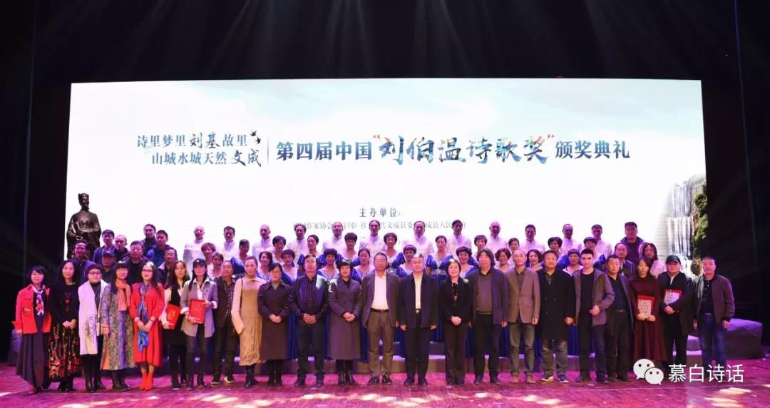 2019年12月12日,第四届中国“刘伯温诗歌奖” 颁奖典礼在“山城水城天然文成,诗里梦里刘基故里”——浙江文成隆重举行。中国作家协会《诗刊》社副主编王冰、《诗刊》社三编室副主任蓝野、吉林省作协副主席、《作家》主编宗仁发、浙江省作协副主席哲贵、浙江省作协诗歌创委会主任孙昌建、温州市文联党组书记周新波、温州市作协主席程绍国、文成县政协主席刘金红、文成县人大常委会副主任钟信友、文成县人民政府副县长金一玲、文成县政协副主席雷旭燕,以及来自全国著名的诗人、作家(评论家)刘波、黑子、郝随穗、白鹤林、安琪、闫太安、胡茗茗、谢飞扬、踏歌、程向阳、三色堇、贾丽、付海平、李之平、张玉荣、李政龙等领导和嘉宾出席颁奖典礼并为获奖者颁奖。