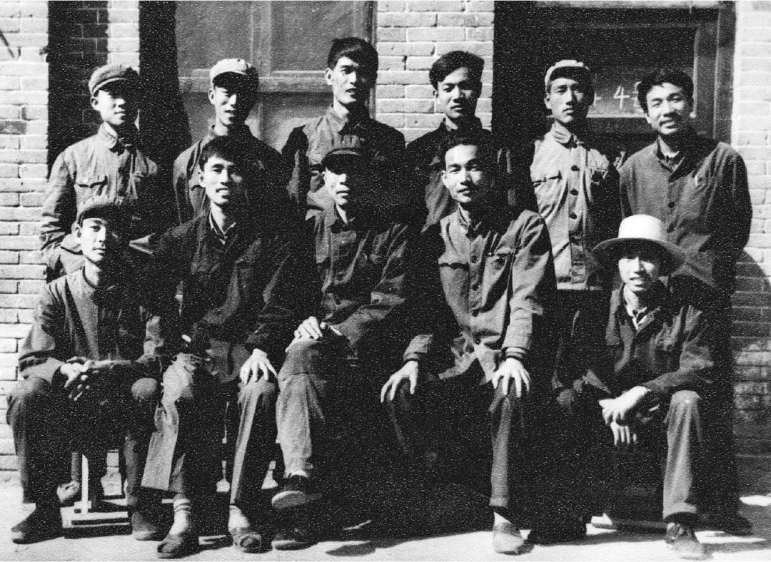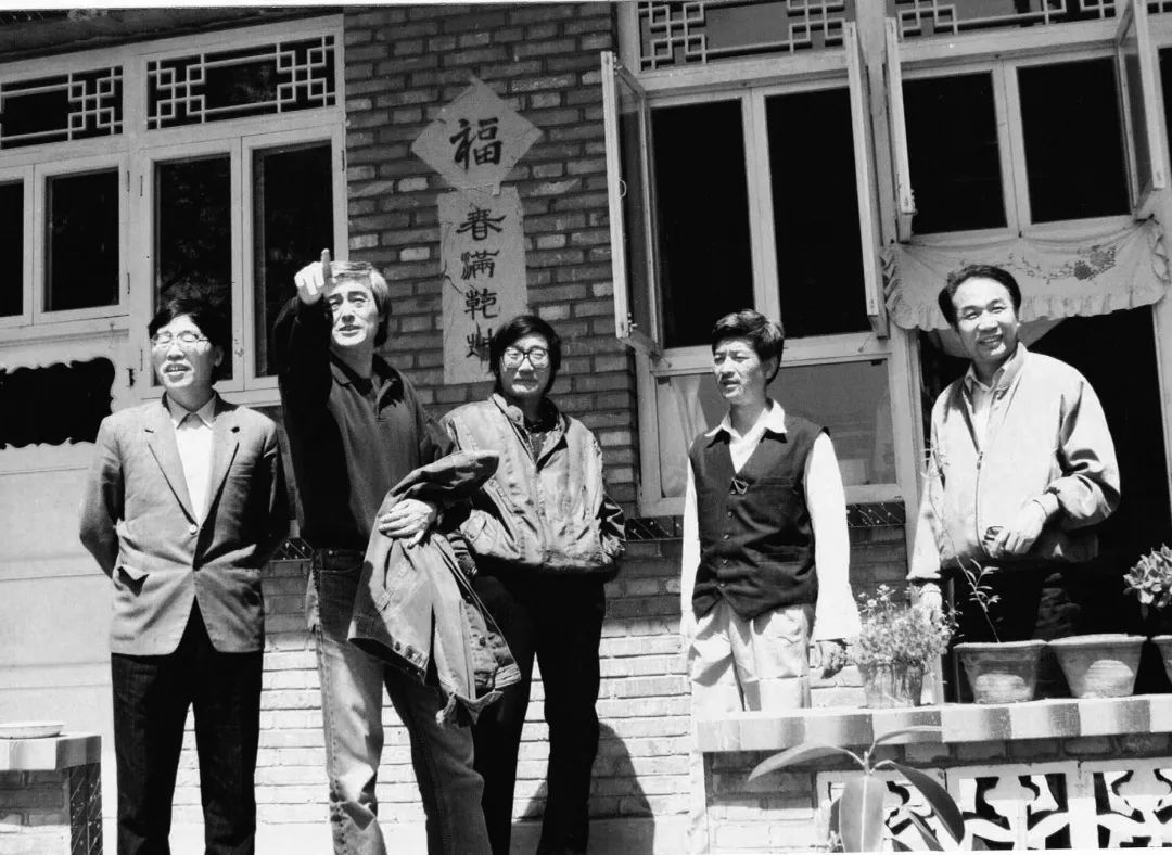1994 年5 月,《诗探索》编辑部举办“白洋淀诗歌群落寻访”活动。与会者到芒克、根子、多多插队的大淀头村,在芒克插队时的朋友张旭家门前合影。(左起:吴思敬、芒克、陈超、张旭、林莽)