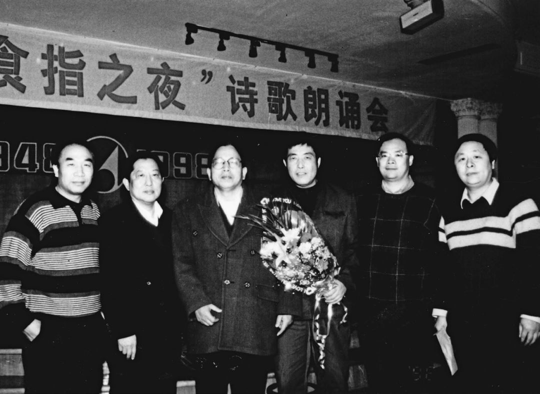 这是1998 年12 月食指回家乡时在济南举办《食指之夜》朗诵会。(左起:林莽、桑恒昌、袁忠岳、食指、高小刚、刘福春)