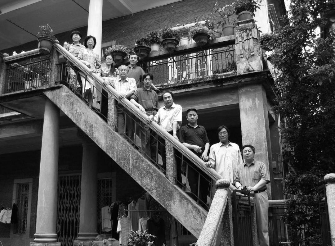 2005 年5 月在厦门,举办“春天送你一首诗”活动,登完日光岩后到诗人舒婷家小座。图为在她家楼梯上留影(上起:徐丽松、舒婷、路也、蔡其矫、李志强、大解、林莽、卢卫平、陈超、刘福春)