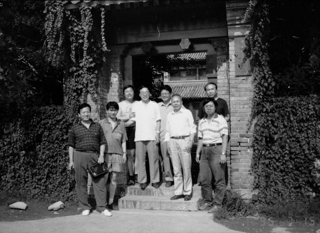 1995 年《诗探索》编辑部成员在北京大学中文系5 院门前合影。(左起:刘士杰、陈旭光、刘福春、吴思敬、杨匡汉、谢冕、林莽< 后>、陈曦)