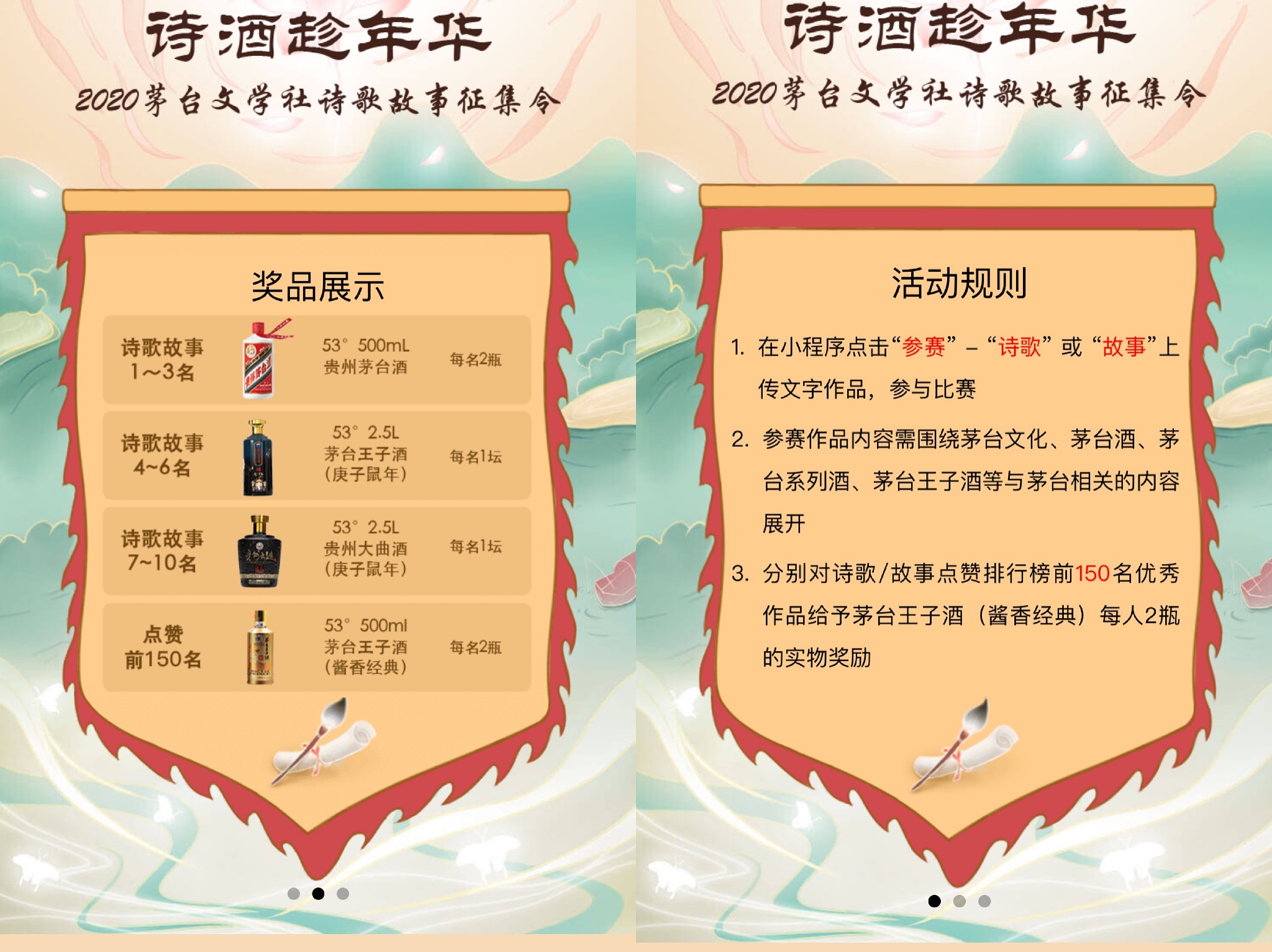 5月25日-6月14日,以“诗酒趁年华——我有酒,你有诗歌/故事吗?”为主题,以“茅台文学社”小程序为载体,征集与茅台酒、茅台酒文化、茅台王子酒、茅台系列酒等相关的诗歌、故事。