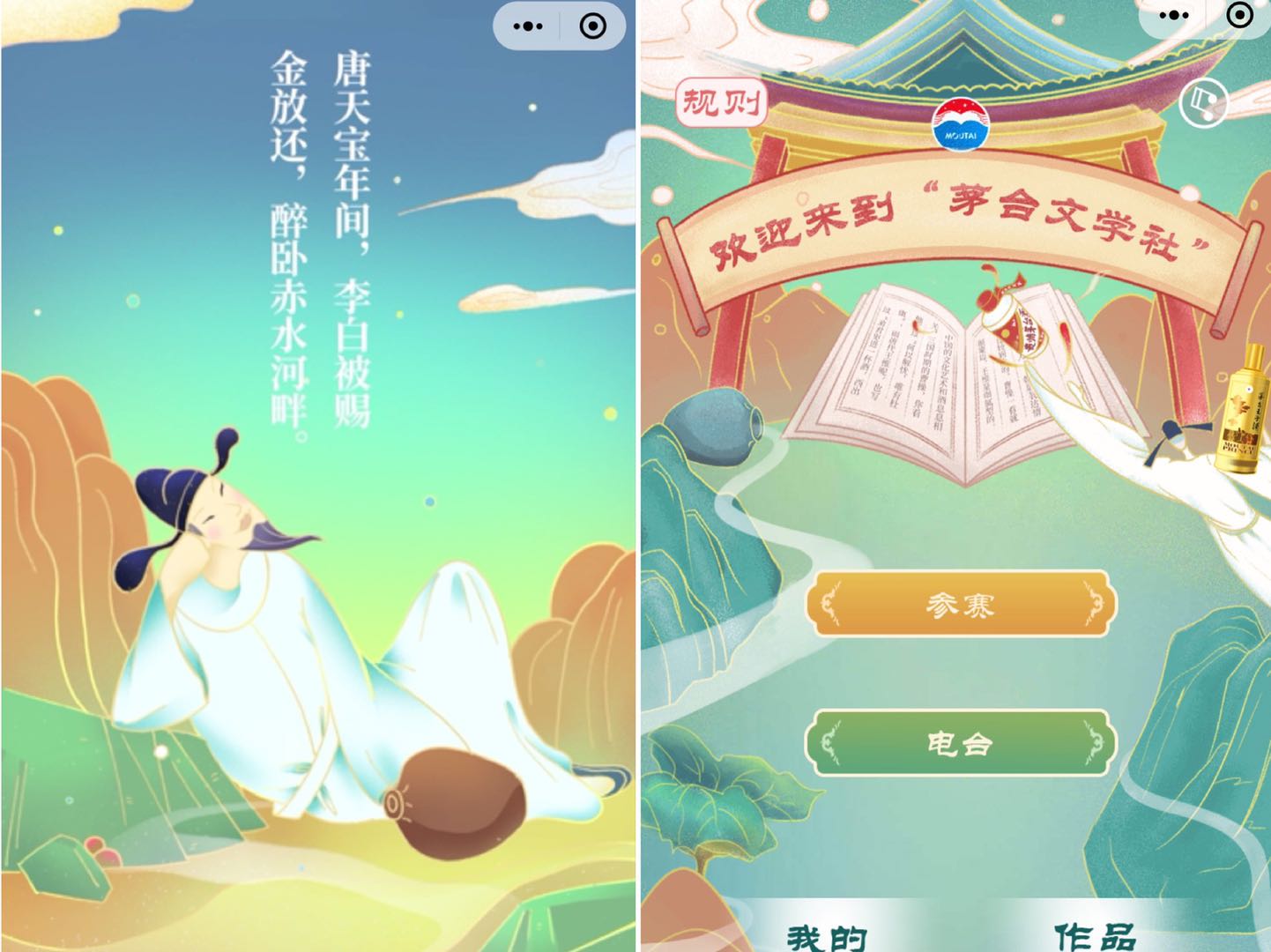 据征集活动负责人介绍,“茅台文学社”小程序整体设计以“时光有温,千年可触”古人穿越为引导,以诗仙李白醉卧赤水河开场,一句“人生得意须尽欢,莫使金樽空对月”,吟出诗仙的飘逸。可谓:大醉方挥毫,人间真诗仙。