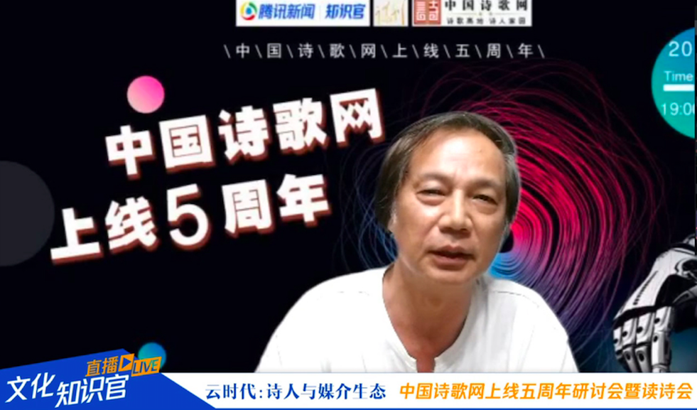 为庆祝中国诗歌网创办五周年,2020年6月18日晚,由《诗刊》社中国诗歌网与腾讯新闻联合主办的“云时代:诗人与媒介生态研讨会暨读诗会”线上直播,吉狄马加、何建明通过视频表达祝贺,李少君、霍俊明、金石开、沈苇、大解、胡弦、汤养宗、李元胜、张执浩、戴潍娜、王单单、冯娜、刘汀、严彬、陈巨飞、谈骁、玉珍、童作焉等20余位当代极具影响力的诗人相聚直播间,在漫游太空主题的虚拟背景下共商云时代的诗歌写作。本次活动由青年作家王姝蕲和《诗刊》社副主编霍俊明共同主持,累计23万人次在线收看。