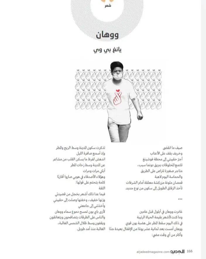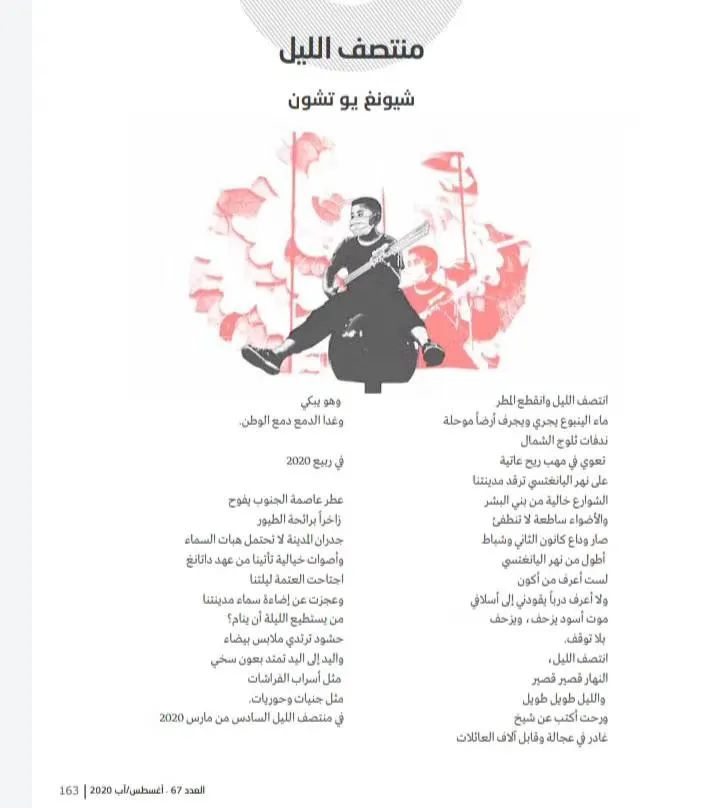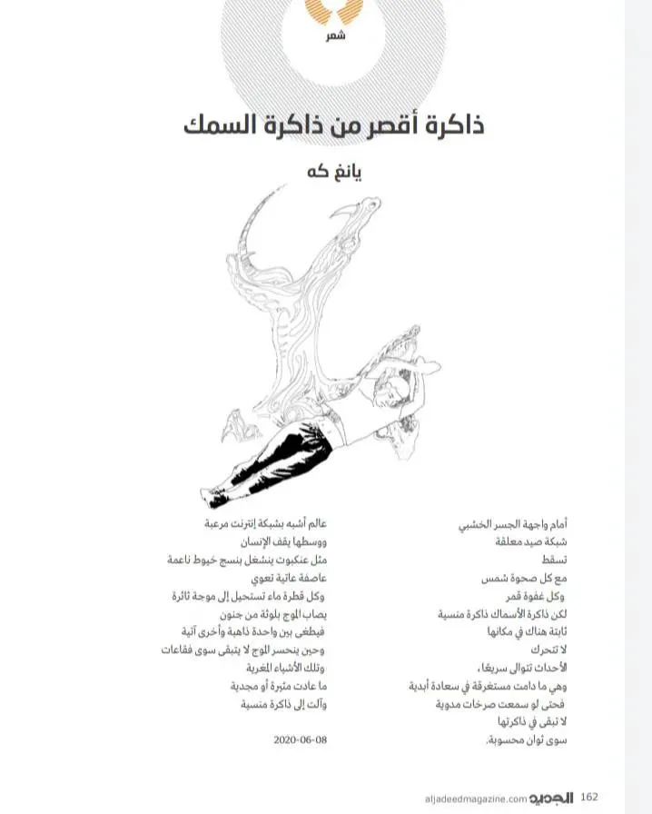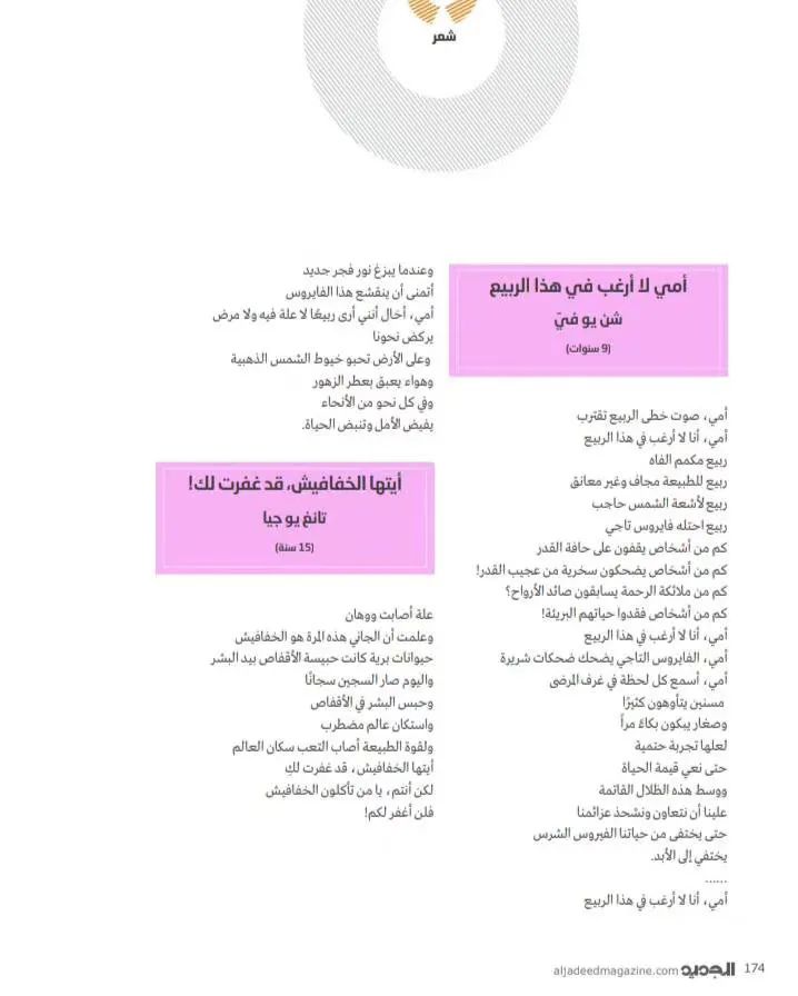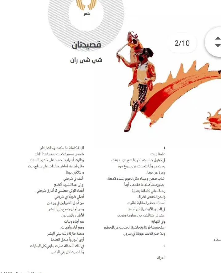 10位诗人分别为杨克、熊育群、施施然、杨碧薇、许晓雯、武稚、秀枝、衣米妮子和张吉平,米拉·艾哈迈德被他们的文字中传递的抗疫精神所感染,将他们创作的《人并不比鱼的记忆更长久》《子夜》《死亡是一种教育》《天使席地而卧》等诗作译成阿拉伯语,在世界疫情波澜未平之时,为尚处于抗疫关键期的阿拉伯读者送去来自中国的抗疫精神支持。她同时翻译的《妈妈,我不要这样的春天》等儿童诗更是为沉浸在悲伤和恐慌中的世界传递出一份温暖和希望。