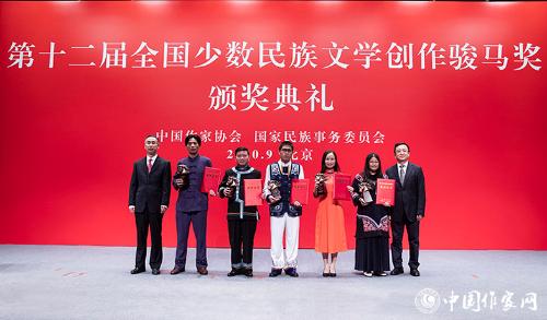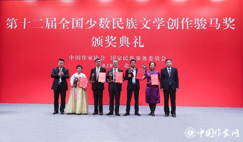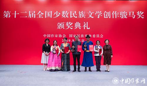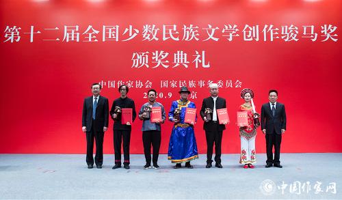 在颁奖典礼上,开赛尔·库尔班、董宏君、敬文东、邓凯、叶尔达、梁鸿鹰等评委代表先后宣读6个奖项的授奖辞。在昂扬欢快的乐曲声中,在掌声和祝福声中,获奖作家、翻译家们身着各具特色的民族盛装,陆续走上领奖台,接过金灿灿的奖杯。这一座座奔腾的“骏马”见证了少数民族文学丰收的喜悦,凝聚着广大少数民族作家和翻译家辛勤耕耘的汗水,也象征着作家们将在民族文学创作道路上迈向更广阔的天地。铁来克·依布拉音(维吾尔族)、莫景春(毛南族)、马占祥(回族)、阿克鸠射(彝族)、海勒根那(蒙古族)、梅卓(藏族)等6位获奖者代表发表了获奖感言。大家表示,人民群众在党的领导下创造美好新生活的生动实践,各民族地区丰富多彩的民族文化,为少数民族文学创作提供了源源不断的创作资源。获奖既是肯定,也是鞭策,将来要继续深入生活、扎根人民,对历史和现实进行更深刻的把握,创作出更多具有时代气象和民族风格的优秀作品。
