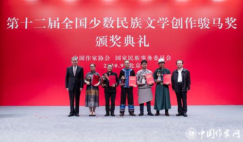 9月25日晚,第十二届全国少数民族文学创作骏马奖颁奖典礼在北京中国现代文学馆举行。中国作协主席、中国文联主席铁凝出席并致辞。中国作协党组书记、副主席钱小芊,中国作协副主席吉狄马加、阎晶明,国家民委副主任郭卫平,中国作协书记处书记吴义勤、胡邦胜、邱华栋,中宣部文艺局局长诸迪,国家民委文化宣传司司长郭建民,作家叶梅、艾克拜尔•米吉提等出席颁奖典礼,并为获奖者颁奖。颁奖典礼由中国作协副主席李敬泽主持。