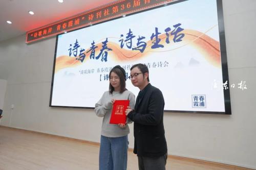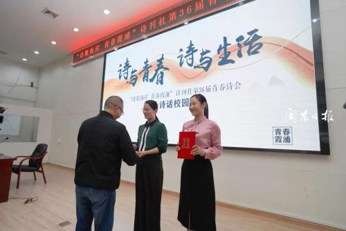 《诗刊》社编辑部副主任彭敏为网络读诗活动一等奖获得者陈潇滢颁奖