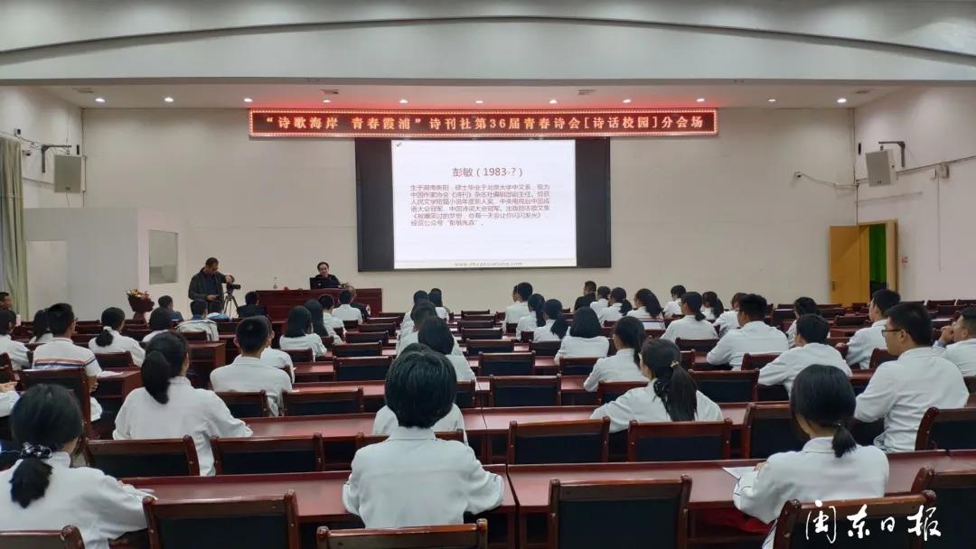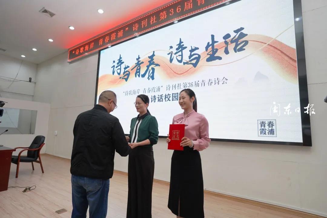 10月22日晚,“诗歌海岸·青春霞浦”诗刊社第36届青春诗会走进霞浦一中举办“诗话校园”活动,为“寻找青春的声音”网络读诗活动的获奖者颁奖。