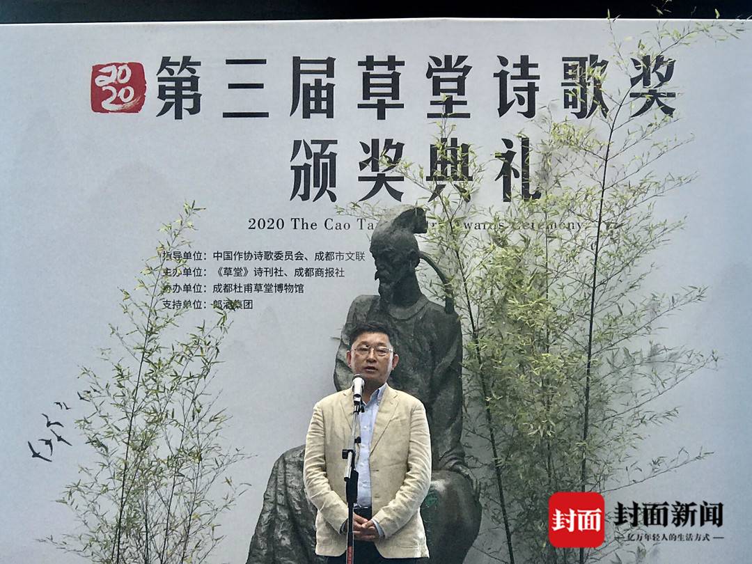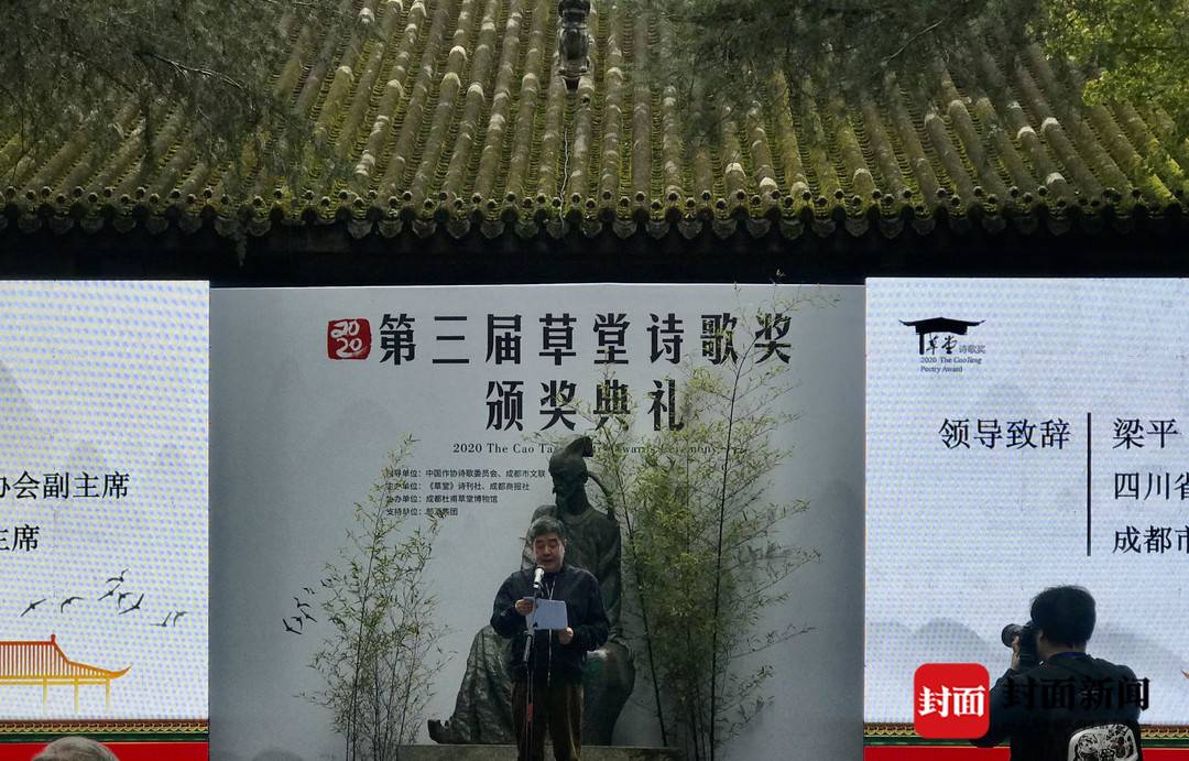 吉狄马加在台上致辞说,非常高兴能在疫情被控制的情况下,我们大家相聚在杜甫草堂,参加第三届草堂诗歌奖的颁奖典礼。我首先向获奖诗人表示祝贺,向为草堂诗歌奖的成功举办,付出了辛勤劳动的工作人员,表示感谢。草堂诗歌奖已经成功举办了两届,产生了很好的影响。我昨天还在安徽参加了一个“量子时代的诗歌”相关的主题讨论。这也让我联想到,我们今天在成都参加杜甫诗歌奖,这么多朋友坐在这里,我们跟杜甫的诗歌应该也能形成一个粒子互动,杜甫也会感知到我们对他灵魂的跨越时空的呼应。“吉狄马加还将杜甫与当下结合起来,“杜甫精神是不朽的,他所实践的现实主义艺术精神,也是不朽的。今天我们如何更好书写时代,书写生活,就是要回到人民的现实生活当中去汲取写作营养和素材。在这方面, 杜甫为我们树立了光辉的榜样。杜甫的诗歌已经跨越国度、语言,被全世界研究和翻译。这说明他已经完全是一位世界级诗人。据我了解,杜甫的诗歌全集,英文版已经翻译完毕。西班牙语、德语、法语版,都在翻译中。而且法文版,很快就完成翻译。 我们今天在这里,就是向杜甫致敬,向伟大的中国古典诗歌传统致敬。”