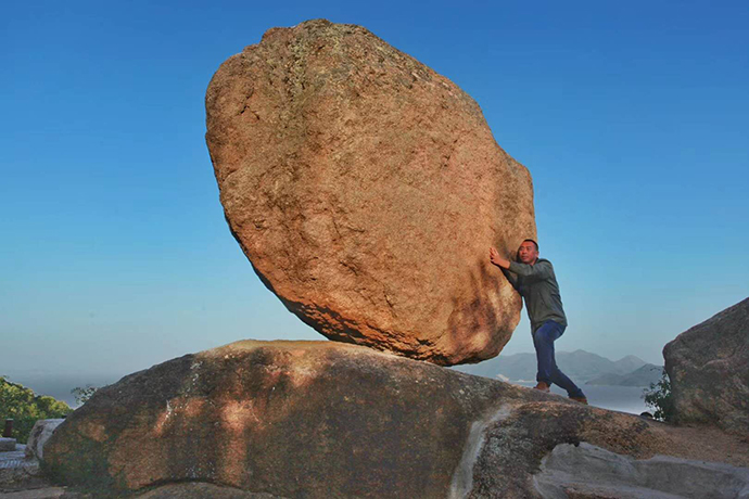 第二天,在三沙镇“中国观日地标”,一块立于崖边的巨石吸引了众人目光,大家都上前与石头合影,或立或坐,只有昭通诗人芒原选择推它。这张推石的照片,也在群里引起一片赞叹:西西弗斯!