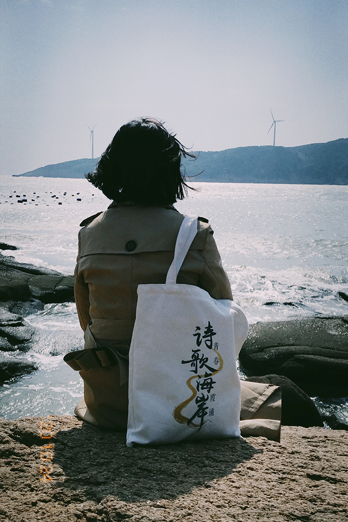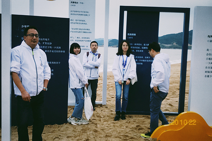 22日下午开幕式前,诗人们来到大京沙滩,一下子就看到了印着自己诗歌的15块背板。在海天的映衬下,那些蓝白相间、高地不同的背板分外耀眼,每个人都与之合影不亦乐乎。然后是简朴而隆重的开幕式,当地官员们讲述着此间的文脉,前辈诗人们向后辈诗人致意、祝福,节目全是诗,最后15个青年诗人走上由海石和沙滩构成的舞台,说是寄语,实则都是诗: