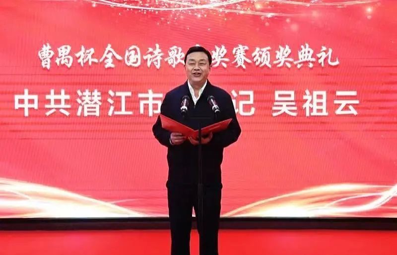 吴祖云在致辞中用著名诗人泰戈尔的一句诗作为开场白,欢迎远道而来的全国文朋诗友。吴祖云说,潜江既是戏剧大师曹禺先生的故乡,也是一座诗歌之城。虽然仅有百万人口,写诗的却有三千多人,遍布各个阶层、各个行业,至今有上百名诗人活跃在中国诗坛,形成了独具特色的“潜江现象”。此次举办“曹禺杯”全国诗歌大赛,是用诗歌讲述潜江发展故事、传播潜江文化魅力、传诵潜江美好生活的一次文化创举,必将进一步扩大潜江知名度、美誉度和影响力,助推潜江文化文艺事业和经济社会高质量发展。