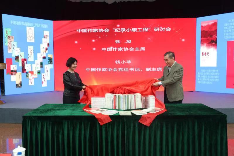 铁凝、钱小芊共同为“中国作协脱贫攻坚题材报告文学创作工程”图书以及“纪录小康”主题图书揭幕。