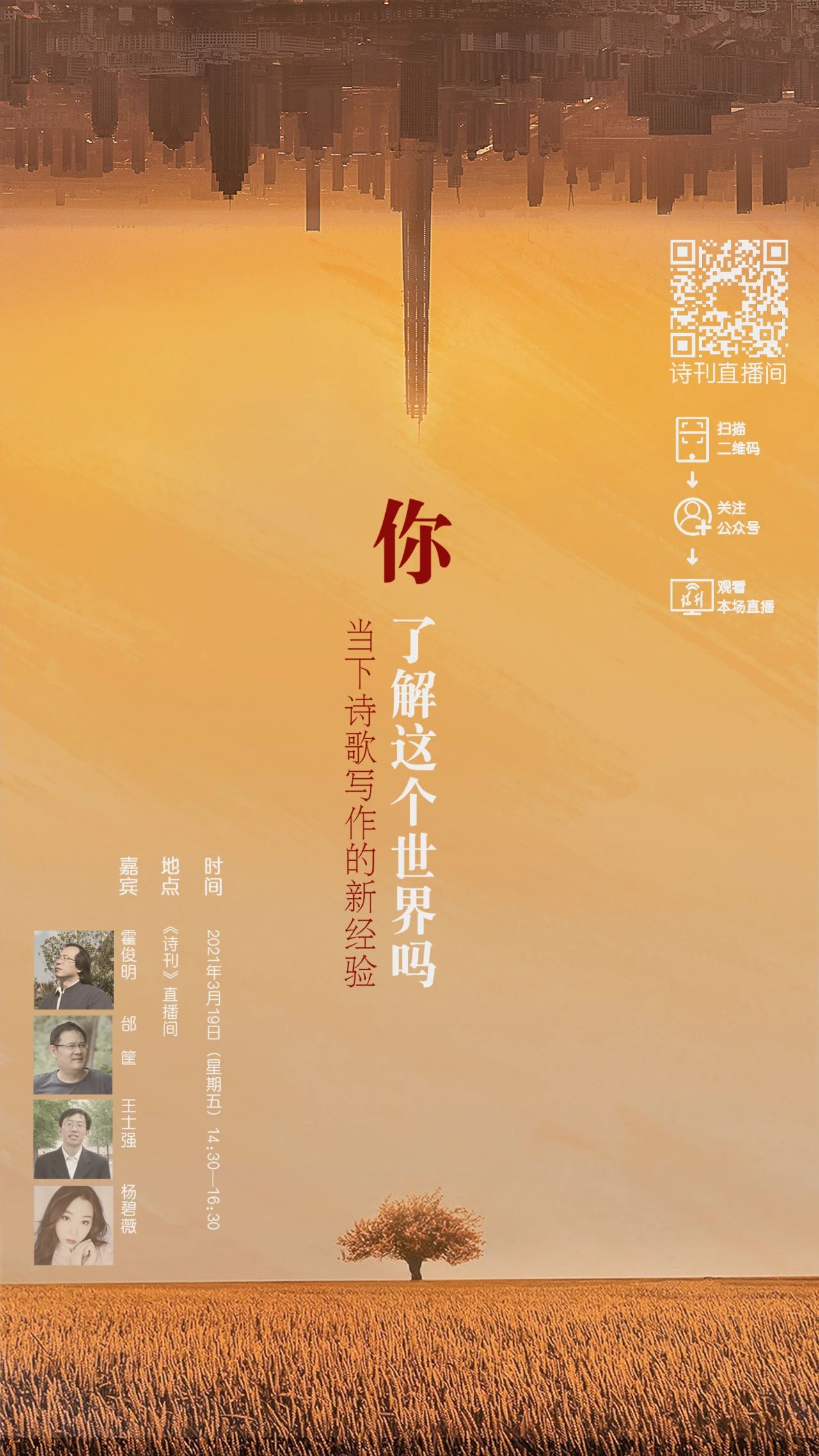 新世纪尤其是新时代以来,随着城市文化、后工业文化、新移民文化、媒介文化、新科技、人工智能以及交通物流网络的迅速发展,无论是时代整体境遇还是每一个人的生活都在时时发生变化。这些前所未有的崭新的经验正在进入诗人的视野当中。现实的新经验和写作的新经验都为我们讨论当下诗歌写作的整体情势、现象以及问题提供了非常多的切口和可能。此次直播,霍俊明、邰筐、王士强、杨碧薇这四位诗人和批评家将围绕“你了解这个世界吗——当下诗歌写作的新经验”展开对谈,期待和欢迎广大诗人和朋友们通过微信扫码观看直播、参与互动。