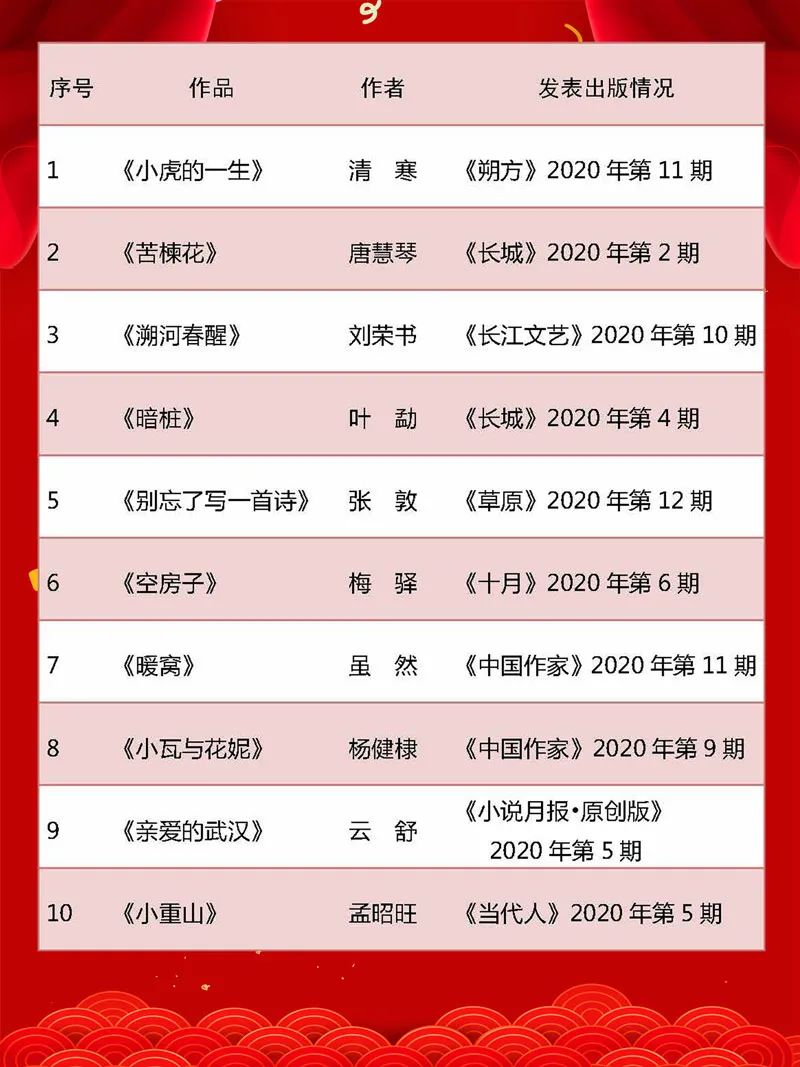4月29日,由河北省作家协会主办的2020年度河北文学排行榜揭晓。河北文学排行榜按照文学体裁分为小说、诗歌、散文三个榜单,经广泛征集作品,公正公平评选,每个榜单各有10篇(部)作品上榜。河北文学排行榜评选活动旨在落实《河北省作家协会“出作品、出人才”工作实施意见》,建立文学创作推动机制,盘点和推介河北文学年度成果,鼓励文学精品创作。2020年度河北文学排行榜榜单及评语如下: